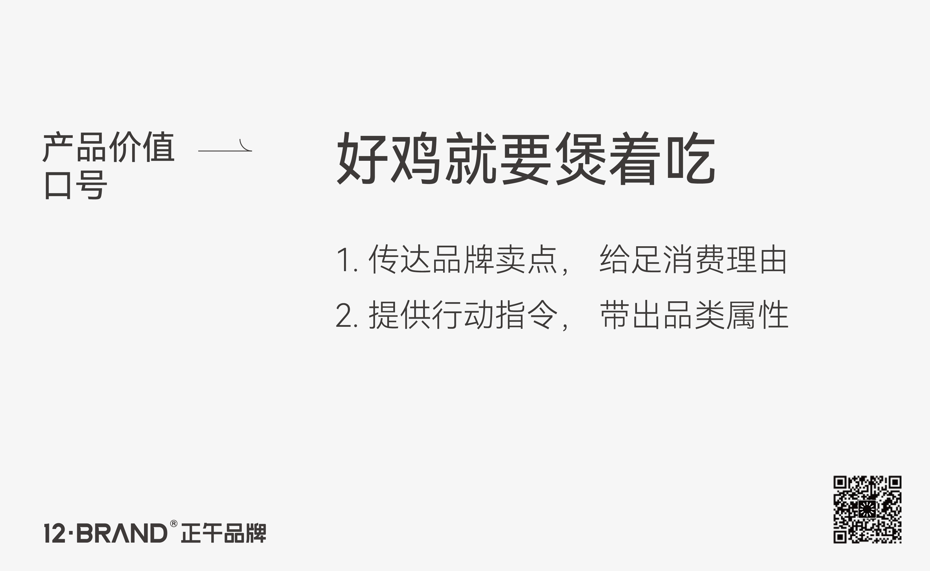 從產(chǎn)品價(jià)值角度,我們建立了品牌口號——“好雞就要煲著吃”,直接傳達(dá)出產(chǎn)品高價(jià)值賣點(diǎn),鏈接食欲刺激消費(fèi),即給足消費(fèi)理由,又帶出品類屬性。